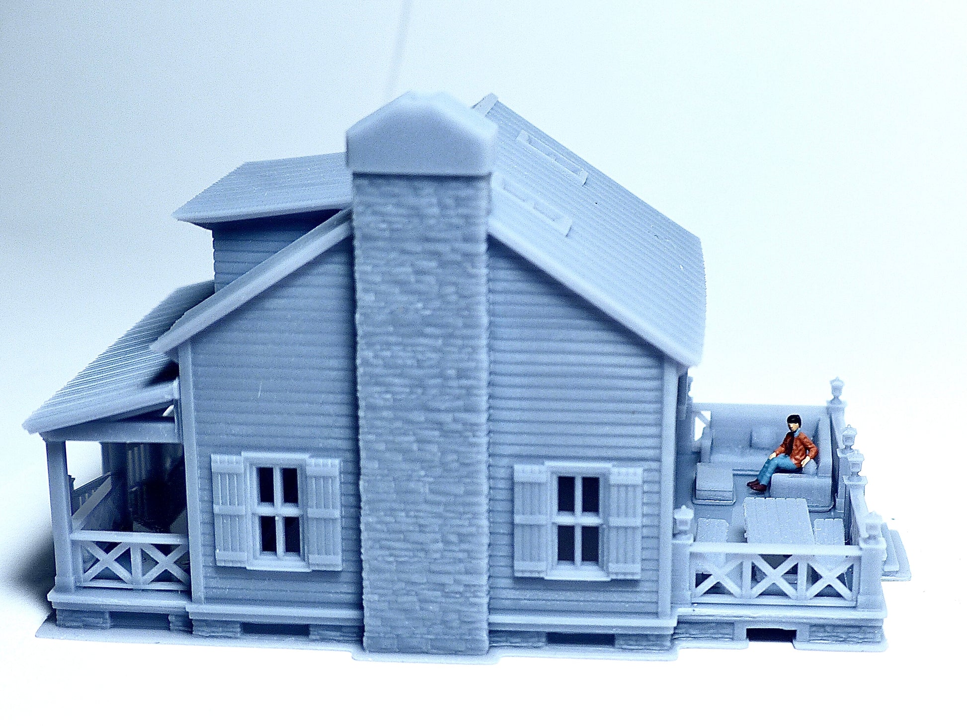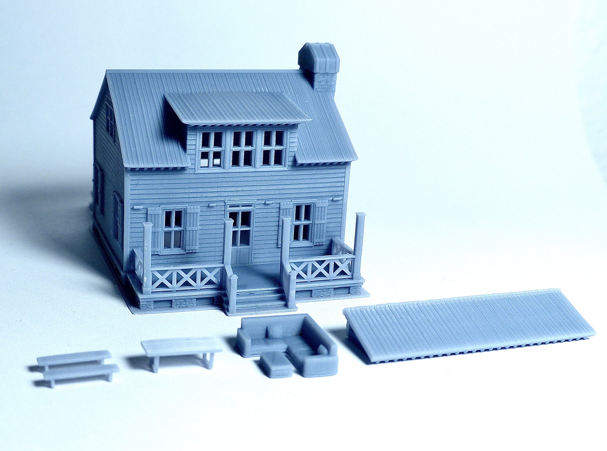 The building is a one and half story cottage house. The space behind the house is a terrace for relaxing and dining, on the other side, there is a front porch. The house has a metallic roof and wooden siding texture. Windows on the first floor have shutters. The sofa and bench and table are including in the package. The roof of the porch can be moved to facilitate the painting process. It can be installed back to the house without glue needed. The building is made of high quality resin to print the fine wall and roof texture. Photos were taken with standard N scale human figure to compare the size. The human figure is not included.