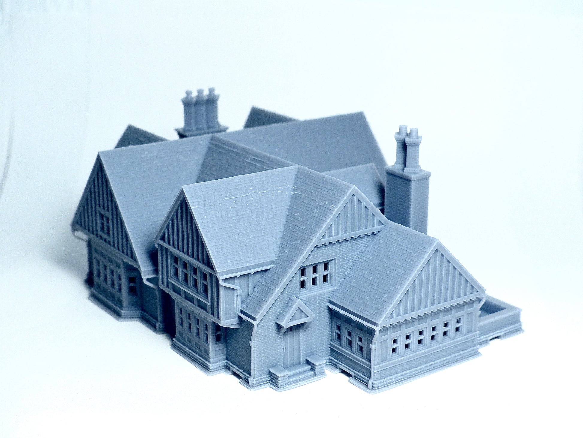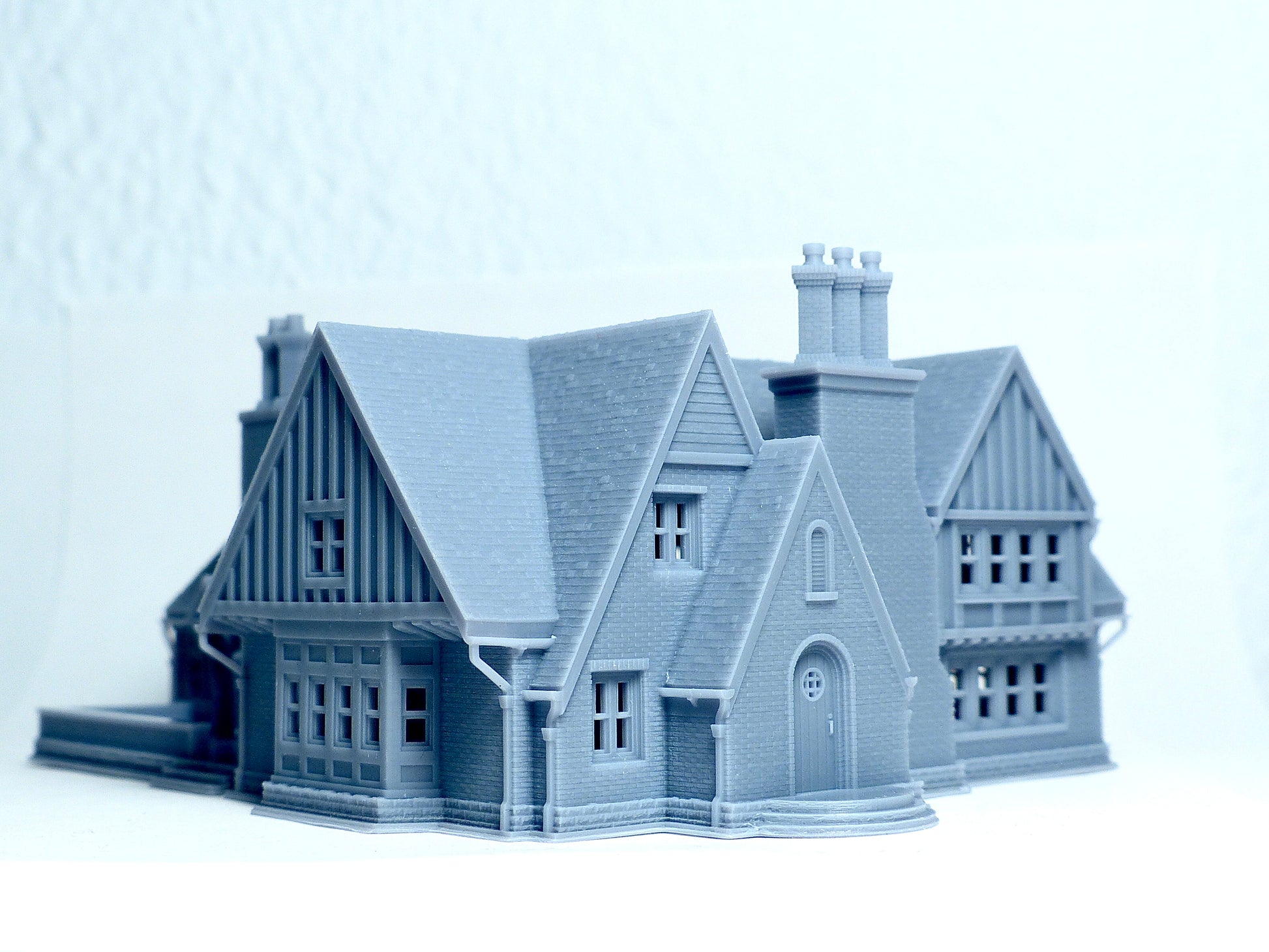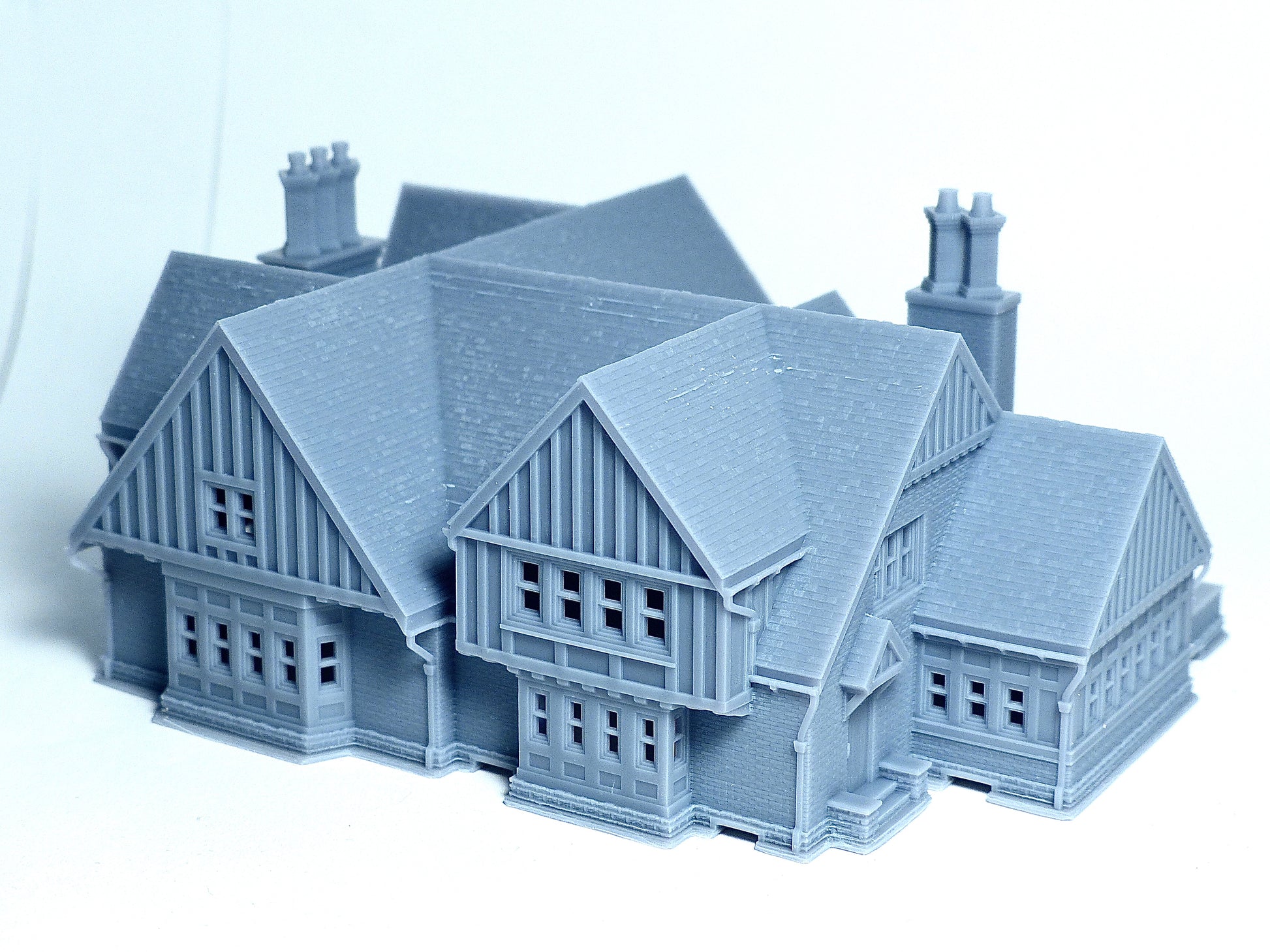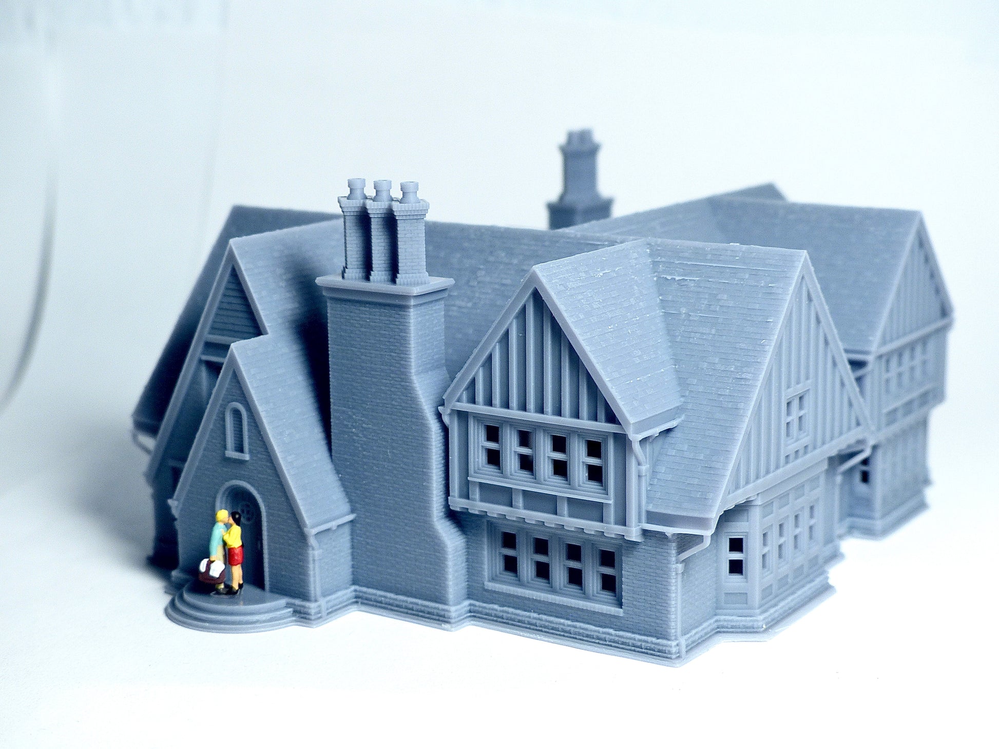 This is a two storey Tudor style big house. The building has a lot of Tudor characteristics with brick and wood structure. The main structure of the house has realistic brick and wood texture and a steep roof with slate texture. There is also a big opening space for activities. The building is made of high quality resin to print out the fine surface texture. Photos were taken with standard N scale human figures to compare the size.